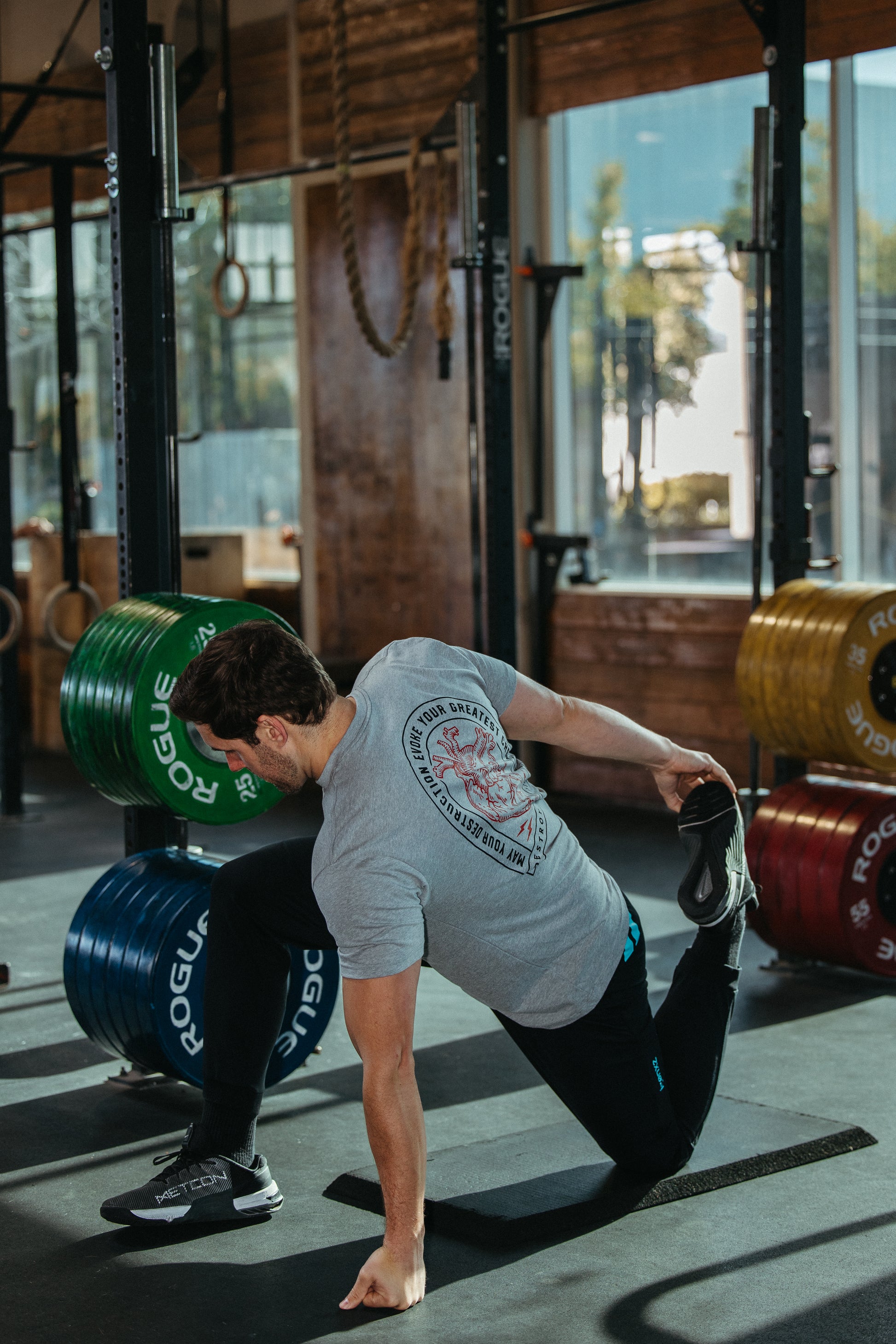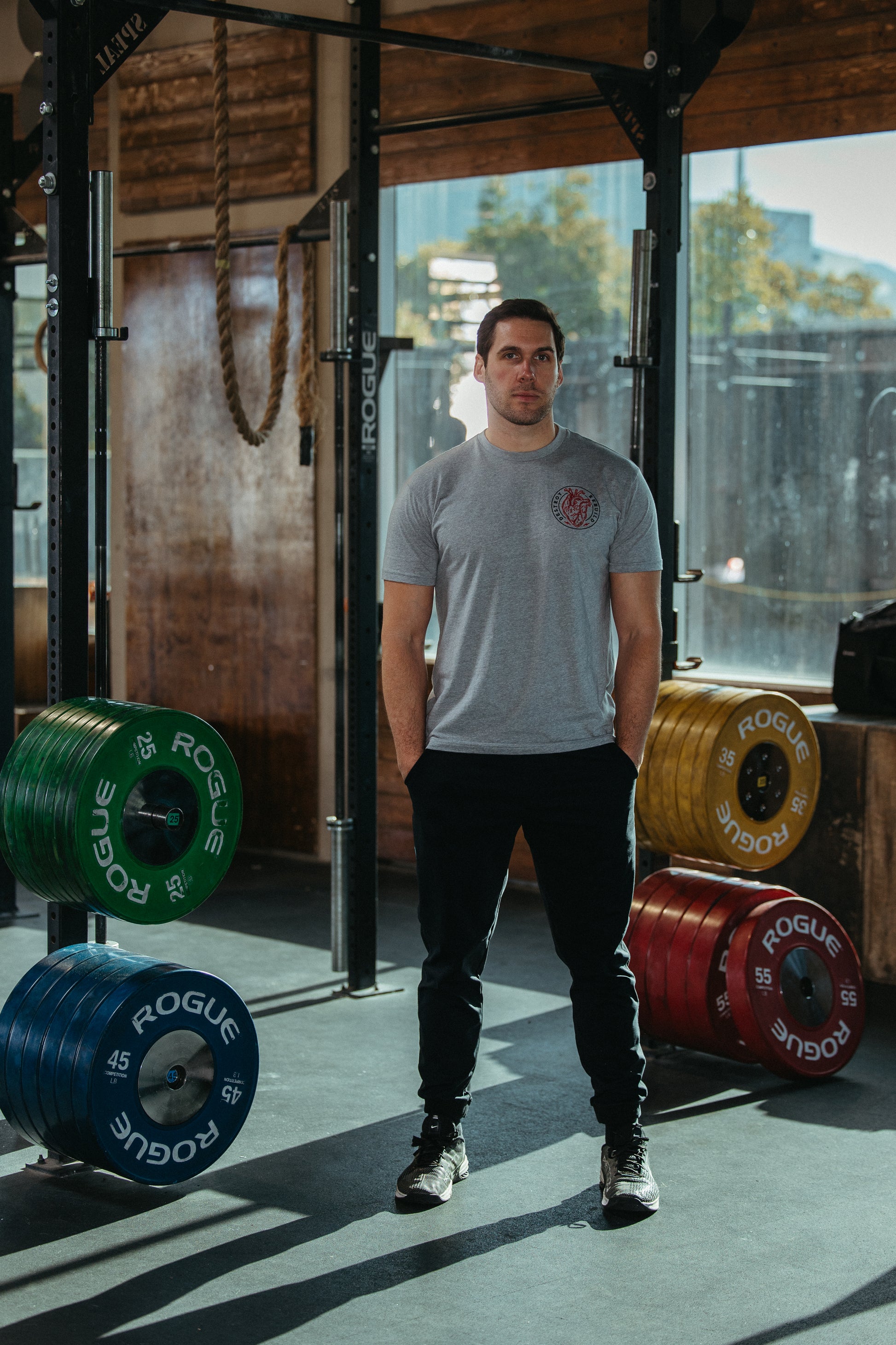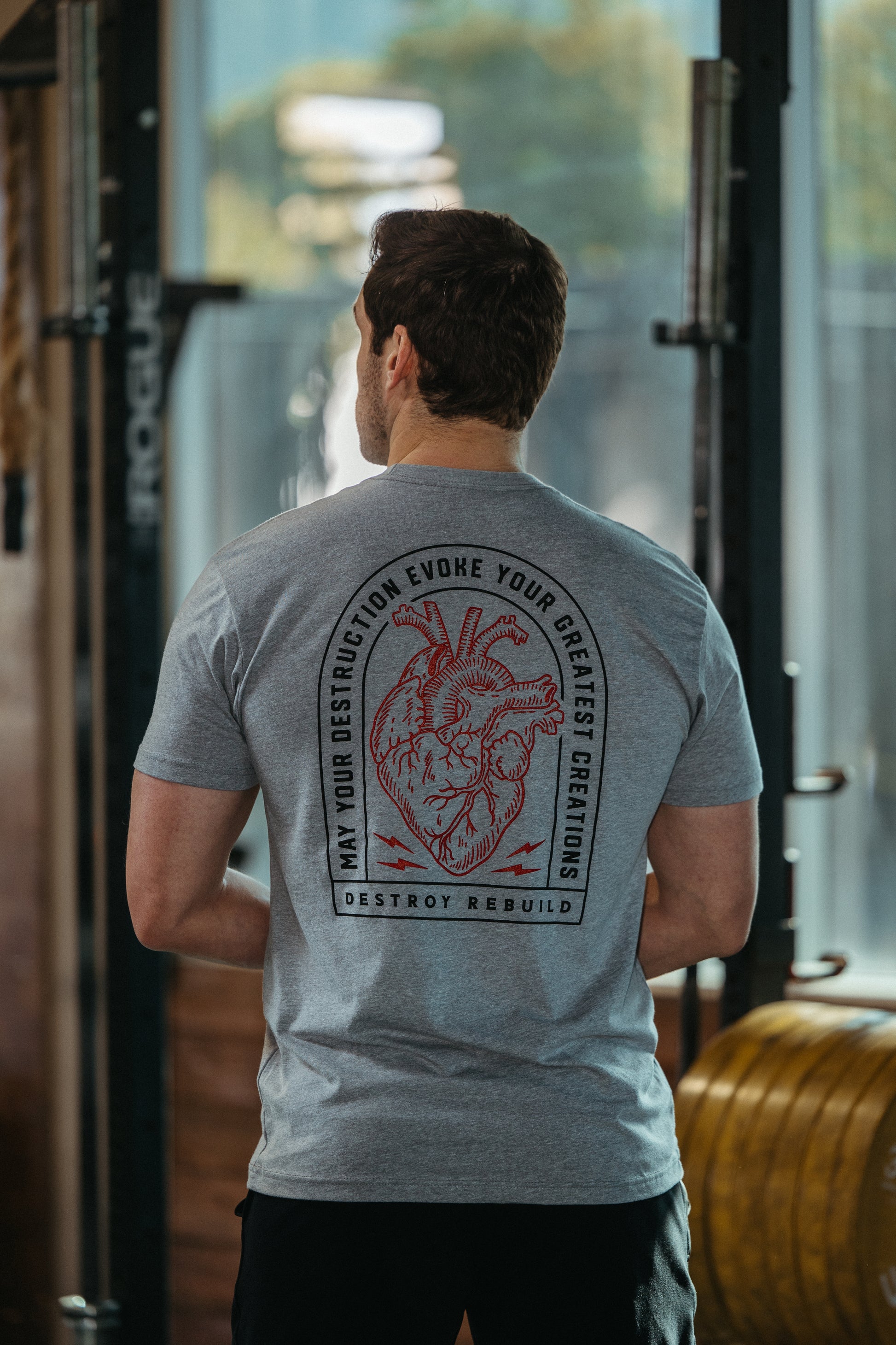 Heather Grey crew neck short sleeve shirt with Creations logo printed on Next Level Apparel CVC T-shirt. Fitted yet mobile shirt that will not get in the way of everyday activity. Perfect for working out as well as wearing out in the community.