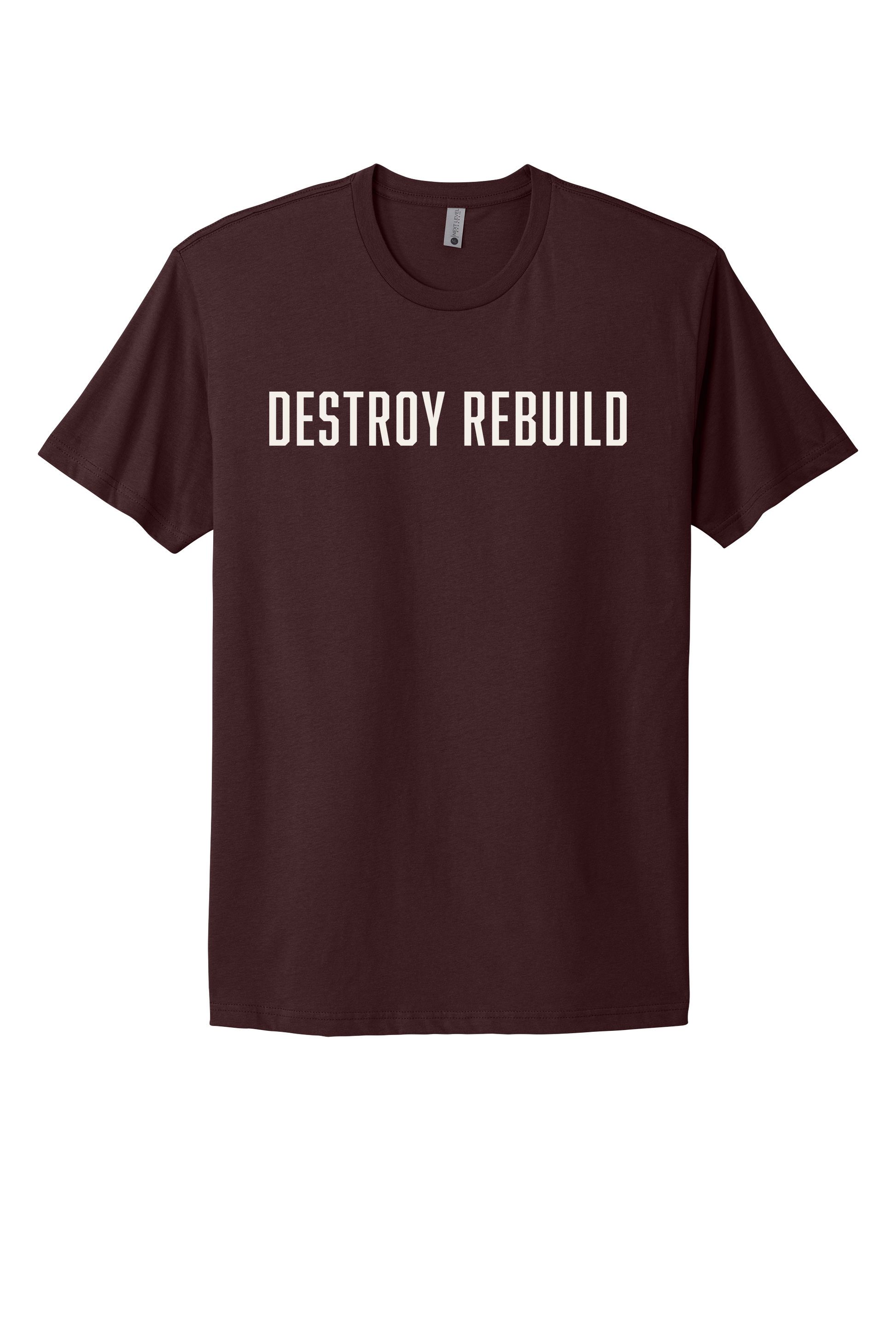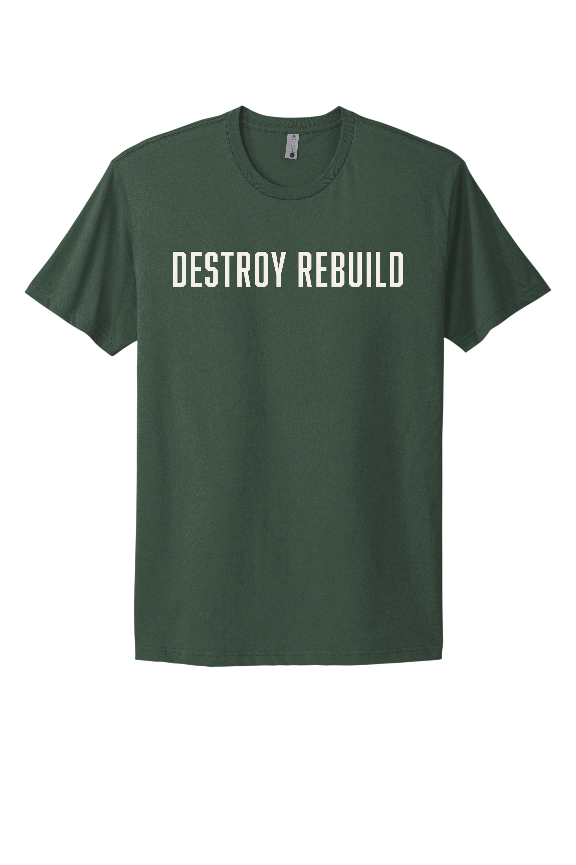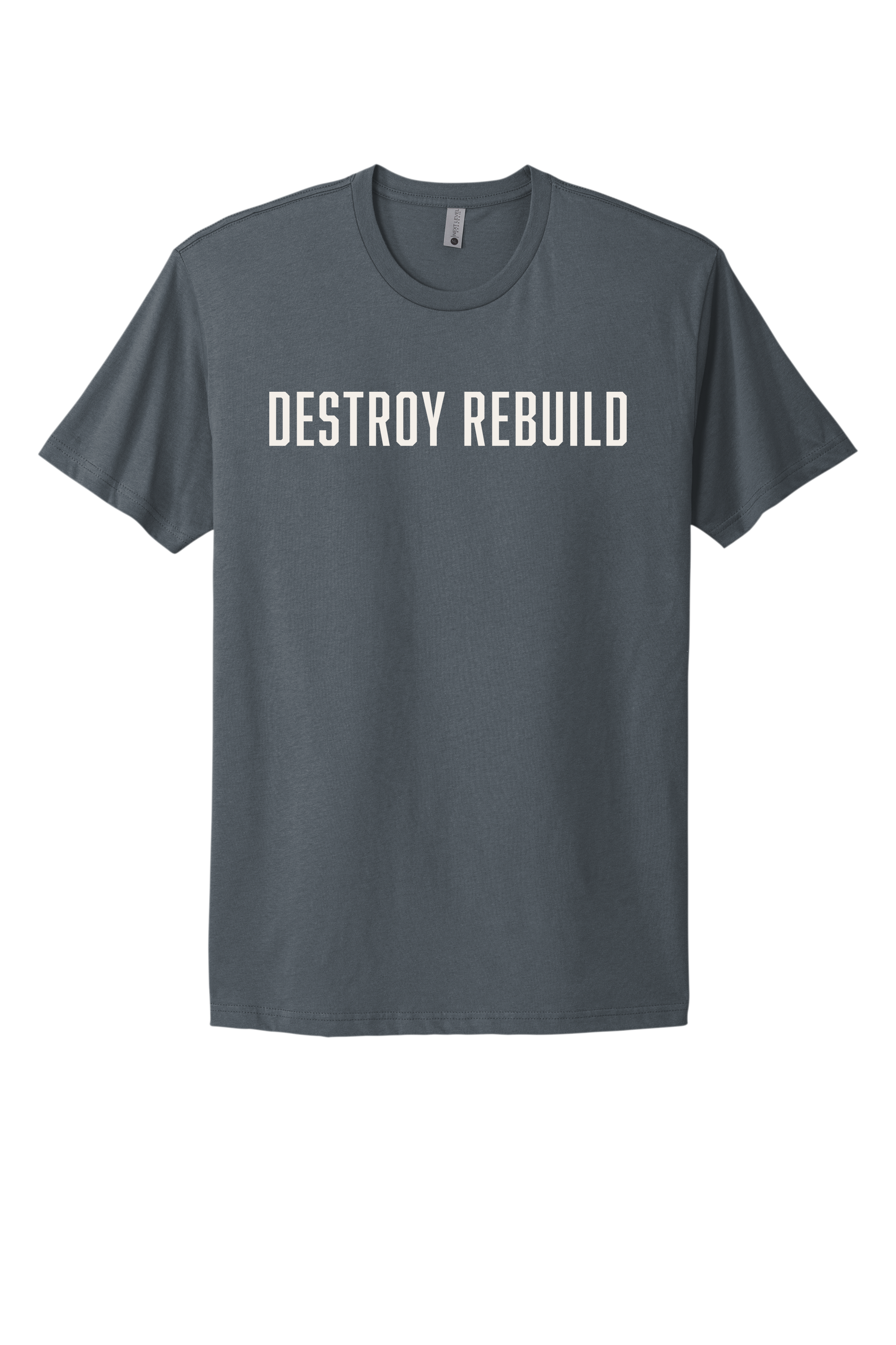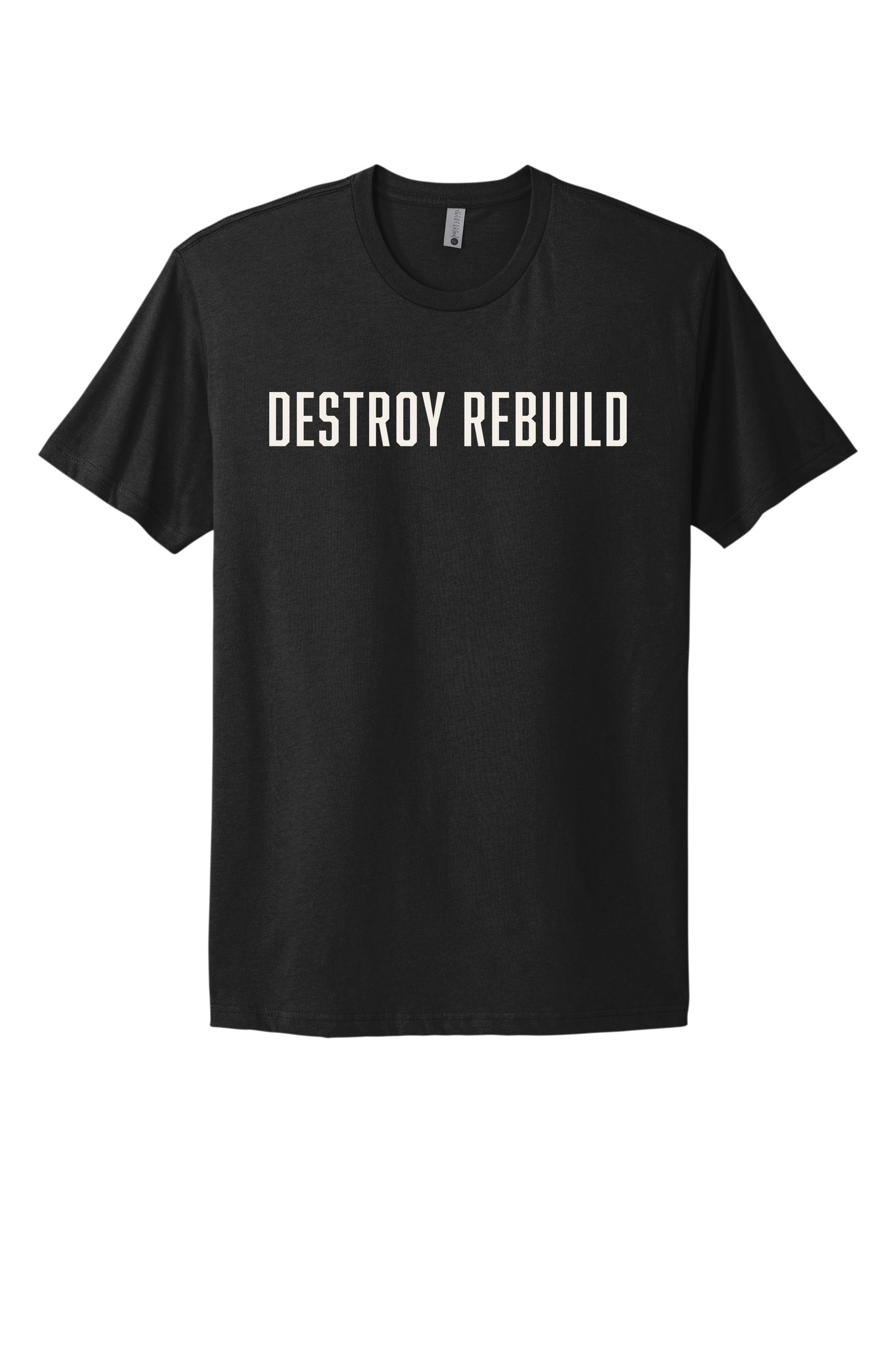 Crew neck short sleeve shirt with foundational DESTROY REBUILD design printed on Next Level Apparel T-shirt. Fitted yet mobile shirt that will not get in the way of everyday activity. Perfect for working out as well as wearing out in the community.